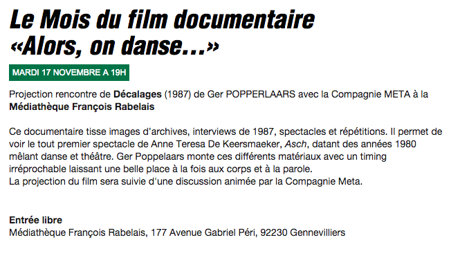 Venez (re)découvrir des spectacles de danse du XXème siècle. Chaque jour, nous projetterons une nouvelle pièce chorégraphique que nous visionnerons ensemble, puis nous prendrons un temps pour échanger nos impressions et sensations. Nous vous attendons nombreux !